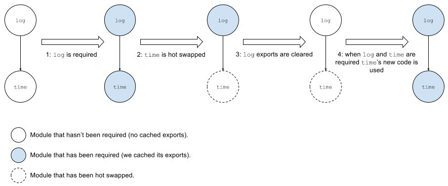Gdy log jest wymagany, środowisko wykonawcze zbuforuje jego eksporty oraz eksporty time (krok 1). Jeśli time zostanie zmodyfikowany, proces HMR nie może zakończyć się po prostu zastąpieniem kodu time. Gdyby tak zrobił, wykonanie log korzystałoby z buforowanej kopii time (starego kodu).