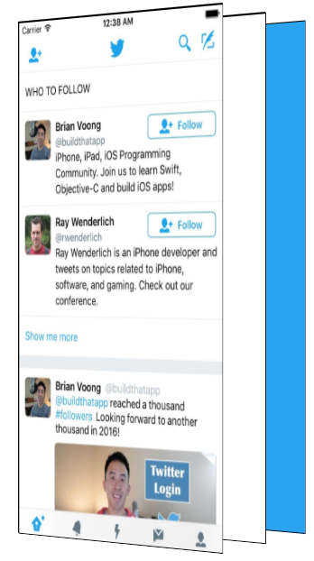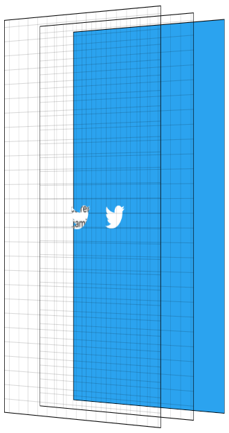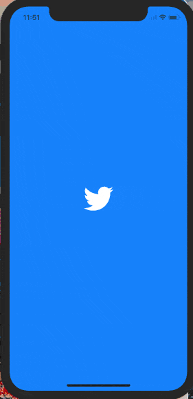 Początkowo przyjąłem błędne założenie, że niebieskie tło i ptak Twittera stanowią warstwę na wierzchu aplikacji, a podczas powiększania logo stawało się przeźroczyste, odsłaniając aplikację. To podejście nie działa, bo przeźroczyste logo pokazałoby niebieską warstwę, a nie aplikację pod spodem!