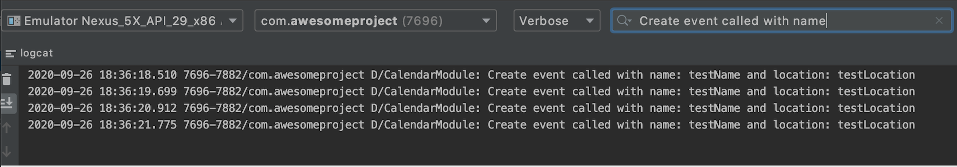 Skonfiguruj metodę createCalendarEvent() dla CalendarModule, którą można wywołać w JS za pomocą CalendarModule.createCalendarEvent(). Na razie metoda będzie przyjmować nazwę i lokalizację jako ciągi znaków. Opcje typów argumentów zostaną omówione wkrótce.