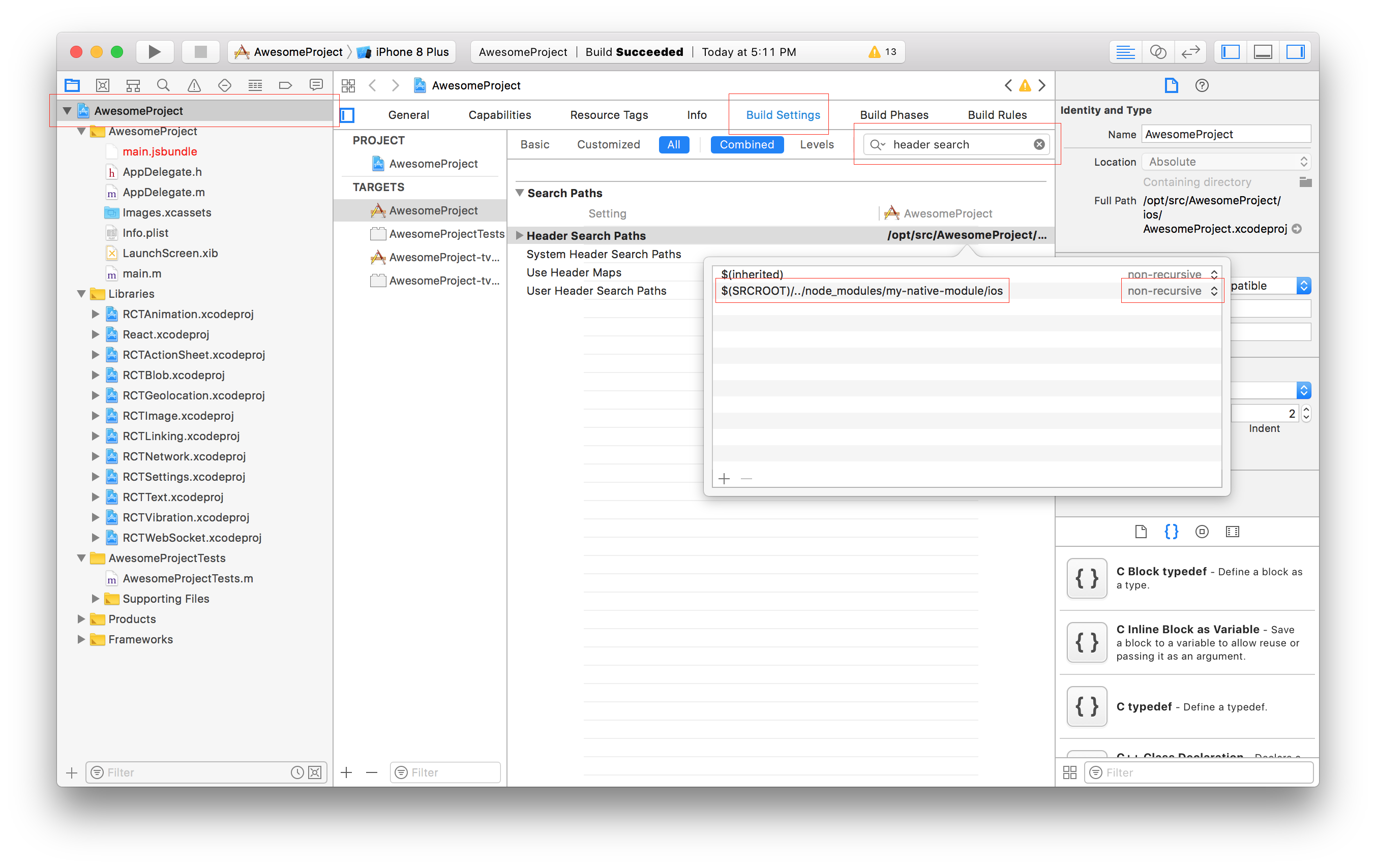 Jeśli potrzebujesz wywołać ją z poziomu kodu natywnego, musimy znać nagłówki biblioteki. W tym celu przejdź do ustawień projektu, wybierz Build Settings i wyszukaj Header Search Paths. Tam dodaj ścieżkę do swojej biblioteki. (Wcześniejsza dokumentacja zalecała użycie recursive, ale nie jest to już polecane, gdyż może powodować subtelne błędy kompilacji, szczególnie przy użyciu CocoaPods.)